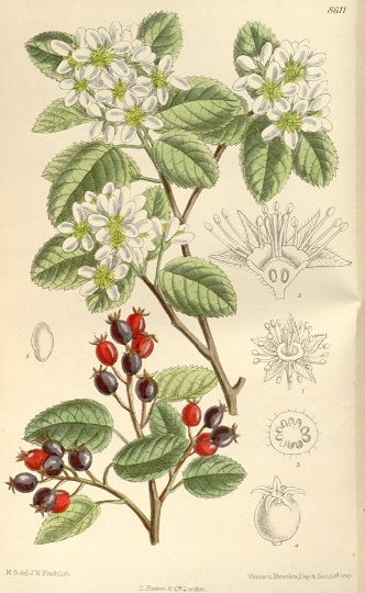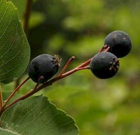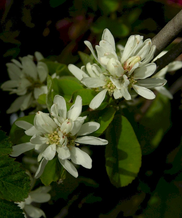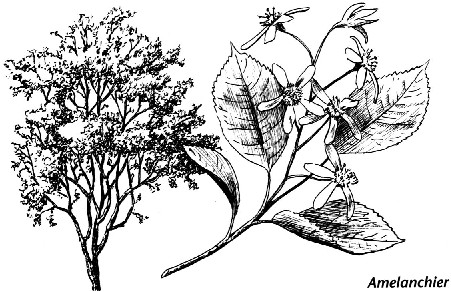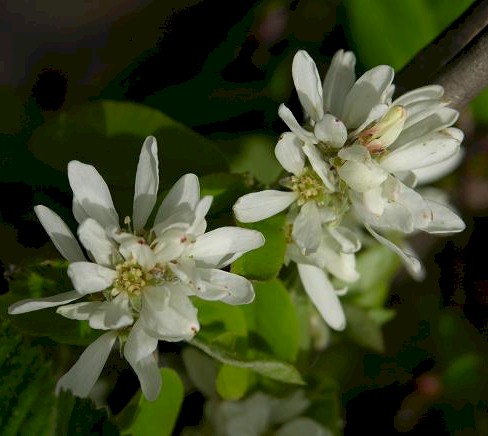 Habitat and Geographic Range: Found on sloping sides of mountains, moist hillsides, on wide prairies, or along side streams or lakes, the Serviceberry is often seen growing as small trees or shrubs. Thickets of this tree are to be seen almost completely across the depth and breadth of the Americas from the Siskiyous clear north to the Canadian/Alaskan tundra. From Newfoundland to Florida, into Texas and Oklahoma, the Serviceberry is equally at home in New Mexico as it is in New York. USDA Hardiness Zone: 3-10. Serviceberry changes form as the growing conditions dictate, forming only shrubs at the edges of it's normal growth range but growing into it's larger tree form where it finds the space and environment. It likes to follow fence rows and to meander along the edges of woods, and can be found growing peacefully among vine maples, all manner of wild roses and other shrubby plants or small trees. It's companions are often windbreak members or woodland plants. Along the sunny canyons and rocky slopes of the Sierras, it is more creeping in habit instead of it's usual upright shrub form. Medicinal uses by Canadian Native peoples: the bark was steeped into a tea for stomach troubles, the bark and twigs were used as tea for recovery after childbirth, and they were combined with other plants for use as a contraceptive. The tough hard wood proved an excellent material for making arrows, for digging sticks, spear shafts and handles for tools. Saskatoon sticks were used to spread out salmon for drying, and the branches were used to construct shelters. Propagation: Serviceberries are very easy to propagate. Seed is said by some to be the easiest way to obtain new plants, as can be seen by the seedlings that will sprout beneath older trees. You can store the seed but it can be a bit slow to germinate, sometimes taking as long as 18 months. However, the quality of seedling plants cannot be guaranteed. Some will grow true to the parent and some will create a completely new variety. |