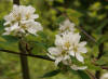 An Appalachian dialect version is Sarvistree. The Juneberry name began, of course, because the fruit usually begin to ripen in that month. Whatever you call them, Saskatoon, Serviceberry, Sarvisberry or Juneberry, we just call these native berries a most delicious gift from a delightful tree. Uses of Plant: A wonderful landscape plant, the flowers, foliage and bark are attractive year-round. Not invasive, the Serviceberry can be planted without fear in beds with other shrubs or trees or as specimen plants. Very resistant to air pollution, they can be grown with a single trunk or a multiple-trunk grove. They make an excellent windbreak when planted fairly close together so the branches can intertwine to form a living fence. Economically the wood of the Serviceberry is occasionally made into tool handles, but it's most common contribution to humans and wildlife are the delicious berries. Wildlife benefits: Serviceberries are eaten by numerous bird species, including pheasant, grouse, mockingbirds, northern flicker, blue jay, American crow, cardinals, cedar waxwings, towhees, American redstart, gray catbird, American robin, varieties of thrush, Baltimore orioles, and many others. Birds love them when they are fattening up for their fall migration. Squirrels, chipmunks, fox, coyotes, rabbits and deer browse its stems, twigs and buds. The spring pollen and nectar are an important source for bees and other insects. |