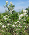 If you decide to go the seed route, you can plant them when fresh and allow them to over-winter in the ground, or you can dry them. Gather the ripe berries and place them in a small bucket of dry, clean sand. Crush them with your hands while you mix them with the sand. Sift the sand/seed mix through fine screen to remove larger pieces of fruit. You can then plant the mixture in rows, aiming for 3 seeds per inch. Germination of seeds planted in this manner will happen in the following spring. Expect a germination rate of less than 50%, and the seedlings will grow about 1 foot per year. Seeds may be the best way to grow a large number of plants, but for the home gardener, we prefer the other methods. Culture: Easily grown, Serviceberries' very favorite soil is a rich loamy mix, but they will grow in just about any kind of soil as long as good drainage is provided.If you are growing them for large fruit, by all means give them compost, plenty of water and lots of sun. But if you want more flavor, try to mimic their native habitat of full sun to partial shade and a moderately dry soil.Drainage is the only critical element when choosing a site for these plants. They are fairly tolerant of lime, and will even do well in heavy clay.They are very cold-hardy (remember, they do grow up to the edge of the Northern tundra!), and can take temperatures to at least -20°c. Some say they will survive at much lower temperatures. No hothouse babies, these. |