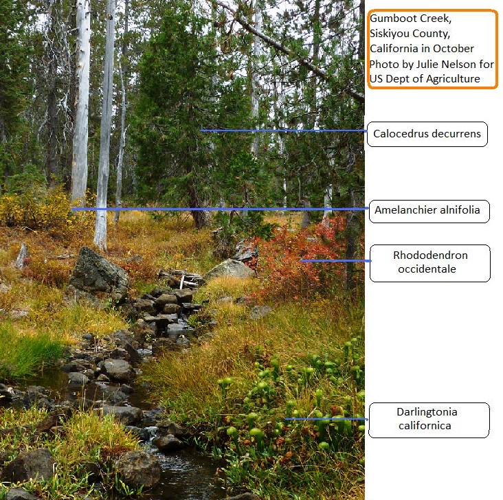 What an edenic scene! The rocks, pieces of trees and shrubs fallen in charming disaray among the colorful fall foliage. Thanks to the astute eye of Julie Nelson, U.S. Department of Agriculture, in this photo we can see the natural, native neighborhood wherein Serviceberry grows in the wild among Calocedrus decurrens (Incense Cedar) and Rhododendron occidentale (Western Azalea). In the foreground is a colony of Darlingtonia californica (Cobra Lily), a rare native of Oregon and northern California. It's preferred habitat are seeps and bogs which are fed by cold running water.
